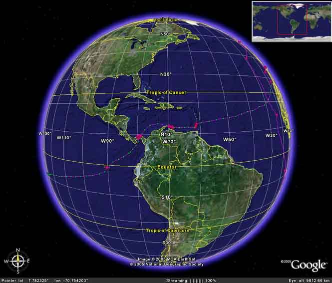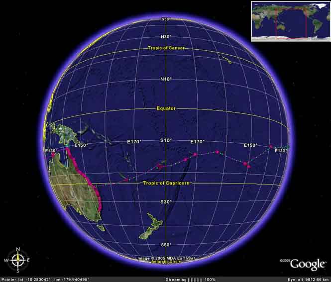 STARSHIP'S CIRCUMNAVIGATION February 1990 - December 1993 With my wife Vicky, and our children Sarah and Christopher we circumnavigated in Starship, our 44' home built, lift keel, aluminium cruising cutter . We departed from Coasters Retreat in Pittwater (near Sydney) in February 1990 and sailed across the top of Australia to Darwin, finally leaving there in early July, bound for the Mediterranean via the Red Sea and Suez. Concerned about the Gulf war and its possible impact on our security and the Suez Canal, we changed our plans at Cocos Keeling and after visiting the Chagos group, headed SW to Mayotte, and thence into the Atlantic via the Cape of Good Hope, finally reaching Ireland in June 1991 and cruising via Scotland as far North as Oslo. We spent part of that winter in Holland and then in February '92 crossed to England, staying over a month in Ipswich and another in London before moving around to the Solent, and then through France via Paris and various rivers and canals, finally reaching the Mediterranean in July 92 - more than a year later than originally planned, and at its western rather than eastern end. Vicky taught both children using the Queensland Distance Education system for over 5 years (not actually corresponding with the school) , but our overall plan was still to be back home in time for Sarah to start high school in 1994. So rather than cruise east to Greece we reluctantly decided after visiting the Balerics and Spain to press on westward, crossing the Atlantic at the end of '92, through Panama in April 93, and back on our mooring in time for Christmas, with 38,000 miles under the keel. It was a great adventure, achieved a goal we'd set ourselves nearly 20 years earlier, and no doubt had a profound influence on our children, who arrived home aged 12 and 10 having visited 38 countries. While a year or so longer than the minimum cruising-rally routes, ours was still a much quicker circumnavigation than many cruisers make. However we had cruised some of the Pacific on previous yachts, and we'd already lived on and cruised Starship for a year before setting off. We know another family who subsequently circumnavigated with children in their high school years using Australian correspondence schooling with excellent results, so another year in Europe probably wouldn't have mattered much overall, and would have allowed us to cruise the eastern Mediterranean. On the other hand we definitely don't regret the detour around Africa, as Mayotte, Mozambique, South Africa, St Helena, Ascension, the Cape Verdes, and the Azores are all fascinating places we would otherwise not have visited. Our children rate the game parks at the top of their experiences. Route Comments One aspect I feel worth mentioning was the clockwise route and timing of our cruise through Scotland and across to Scandinavia in late summer, and then back to the UK in mid winter. This gave us prevailing tail winds up the Irish Sea, in the long lakes of the Caledonian Canal, and across the North Sea, and meant we were transiting France in early summer before holiday traffic and water shortages effected the canals. Had we entered the Mediterranean as originally planned from Suez, we would have in company with many other cruisers, been sailing across Biscay or Northwest through France in late summer or early winter (against the flow in the Rhone and Saonne), probably have wintered in the UK and pushed Northwards into Scandanavia the following summer, and then across the North Sea to Scotland, Ireland, relatively late in the season, against the prevailing SW winds and crossing Biscay to reach the Canaries by November for the transatlantic passage. As things turned out the route we followed made better use of the prevailing winds. The short winter crossing from Holland to the UK took advantage of stable (but cold) conditions associated with a large High pressure system. Another comment is we found the South Atlantic to be pleasant sailing, as was beating against the trades in the North Atlantic in May, when they were quite light. Below are four low resolution Google Earth screen shots of our route. A 125 kB "zoomable" .kmz file defining the route and providing dates and place names can be download here. (right click and select "Save As..") To open a .kmz file you will need to have installed Google Earth on your computer, which is available free from Google Earth - Home , and then to be connected to the Internet to access Google Earth's database of satellite images of the world. The route was reconstructed using Google Earth Plus, from our log and diary notes, and is certainly not a precise navigational record, especially since we used a sextant for navigating across most of the Indian and Atlantic Oceans, acquiring our first GPS receiver in the Caribbean. |