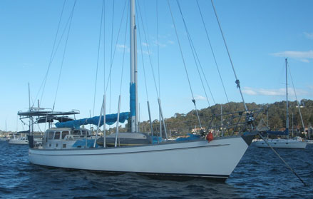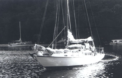 Honeywind's lines are similar to Orca, but we had Jo Adams redraw the keel profile and the stern, and did the sailplan ourselves. Unusual features were a sealed spiral welded steel mast, and a furling system for the light genoa in which the whole stay rotated. Vicky and I built her in our spare time (weekends, holidays, and nights) between 1974 and 77, at "Jerusalem Park" - a small egg and pig farm at Oxford Falls, belonging to a lovely couple, George and Grace Sutherland. The farm is now a private school. The boat was launched fully fitted out, and 1978 we cruised her through New Caledonia, New Hebrides (as Vanuatu then was), the Solomons, and to Cairns via the Louisiades (Islands in the East of Papua New Guinea) and hence back to Sydney. We were married on board in Middle Harbour in 1979, and sold Honeywind in 1980 to provide capital for a home. The first new owner was Arthur Nomminson, who cruised her through the New Hebrides, and probably other places before eventually selling her sometime after 1988 (we went on board when she visited Sydney during the Australian bicentennial). She has probably passed through several hands since, and we noticed her berthed at Mooloolabah in 1989. Last heard she was based at Abel Point Marina at Airlie Beach, where she had suffered localised hull damage during a Whitsunday fun race.
