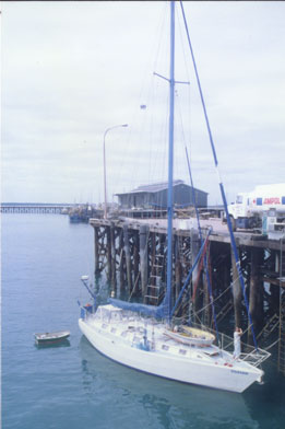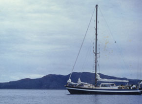 In early 1986 I built the hull and tacked together the deck of Starship at Evans Head (NSW), in a slipway building belonging to our friends Peter and Joan Low. I employed a welder for the hull joints but did most other work myself, working full time on her for just over 3 months. We then trucked the shell back to our front yard in Sydney where I completed the construction part time, including welding deck, tanks, rudder, and mast (again sealed, but this time in aluminium), and fitted her out. She was launched just before Christmas 1988. The family moved on board immediately, and most of 1989 was taken up with a shakedown cruise to the Whitsundays and back to Sydney. We set off on our circumnavigation in February 1990, returning to Sydney in December 1993 via the route shown on the maps. We still own Starship, and I'm slowly refurbishing her (currently in my front yard again) - planning to resume more active cruising when our children are through university.