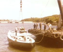 Launching Orca by floating crane 1971 (left) and about a decade later when renamed flying Cloud.