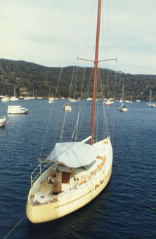We bought the bonded hull and deck in Sydney from Peter Low, and fitted it out during 1980 in Vicky's Mum's back yard at Balgowlah (where we also lived for some years in a caravan). After moving wife and newborn child to a block of land near Airlie Beach in 1981, I returned to sail the boat (partly by myself ) up to Shute Harbour where we put down a mooring. We sailed her occasionally during the year it took us to discover, among other things, that we preferred a cooler climate. We returned to Sydney in 1982, leaving Wayward behind. A flying visit to Shute Harbour brought her only as far south as McKay before the weather intervened, and the next attempt only got as far as Gladstone before I had to return to work. So Wayward finally returned to Sydney ignominiously on the back of a truck. I refurbished her in the front yard of the house we'd bought in Sydney, and sailed her for a year or so around Pittwater, introducing our children to sailing. We eventually sold Wayward in 1986 after having already started to build her successor. Last heard of she was moored near Scotland Island in Pittwater.